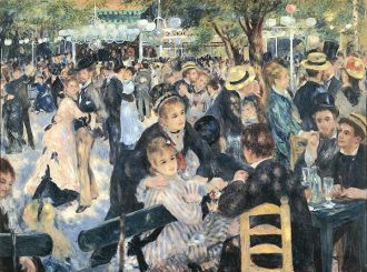 Renoir representa en este cuadro un baile en el Moulin de la Galette, merendero popular del parisino barrio de Montmartre. Se ve la luz a través de los árboles y se refleja en la ropa de las personas, tan diversas en vestidos y posturas.